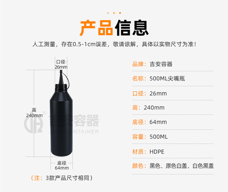 尖嘴瓶適用行業(yè)廣泛,多用于膠水包裝、眼藥水包裝、食品調(diào)料包裝,因其尖嘴特點(diǎn),具備方便滴膠,操作時(shí)流量可控可調(diào),使用方便。